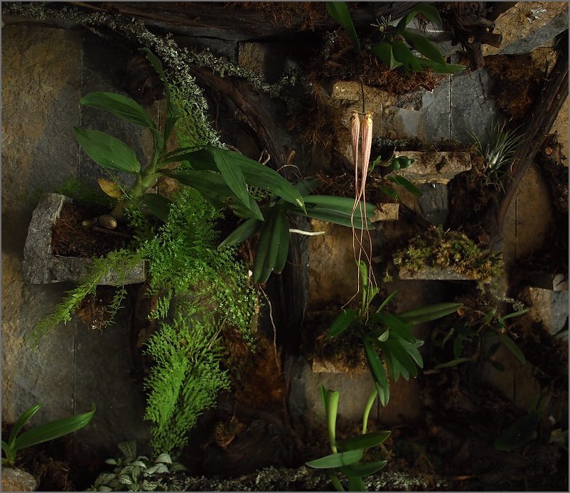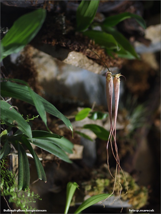 Bulbophyllum longissimum,délka květů cca 20 cm. Vykvetlo na vápencové skále v obyváku po cca 3 měs. od zasazení.... to ma-ja...vyrovnávám na 1 : 1 ...
