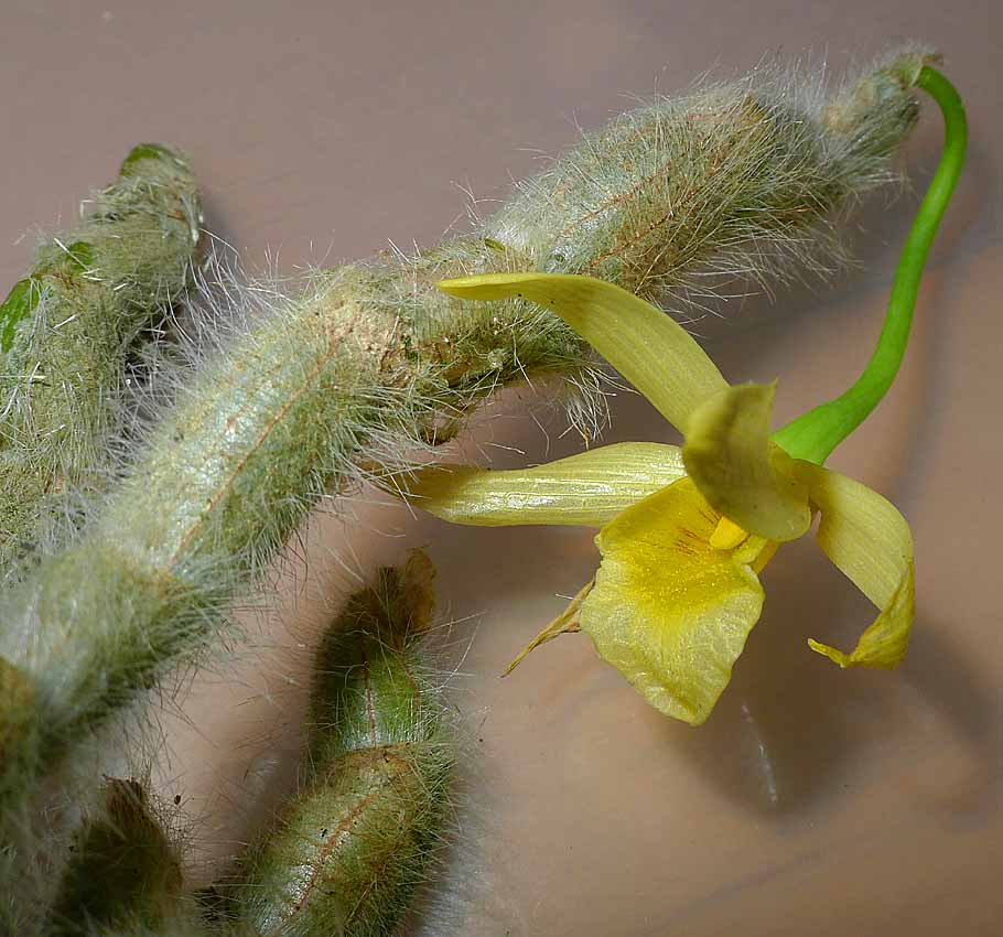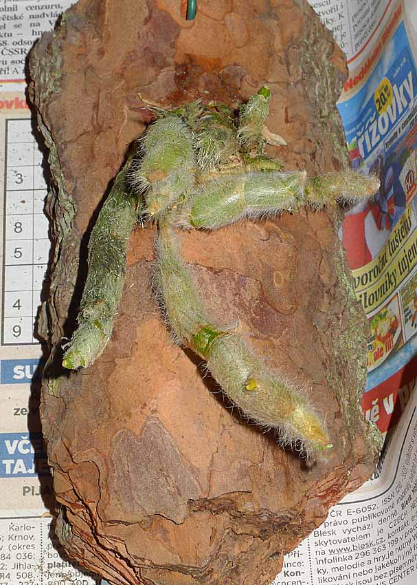 vizir píše: Zdá se,že kytka se rozhodla zahodit květy a začít období růstu.Celkem mě to překvapuje,v minulosti mezi ukončením kvetení a růstem byla vždy pauza.Možná na tom mám i svůj podíl viny.Rostlina se mi zdála seschlá více než v minulosti,tak jsem několikrát porosil kořeny.Myslím ale,že na kulturu to nebude mít vcelku žádný vliv,protože svítím.Na podzim ukončím zálivku stejně až po vyzrání pahlíz i kdyby pahlízy narostly i v druhé vlně. Mně již také kvete. Koupil jsem si v Drážďanech druhou rostlinu a byl na ní květ  . Přilepil jsem ji na borovou kůru abych se dvěma rostlinami mohl experimentovat na více frontách. Nyní mi začíná nasazovat D. parishii ze stejné oblasti. To jsem ale měl celou zimu tepleji v ZZ a bez svícení. To senile bylo v kakt. skleníku při o něco nižší teplotě, takže trochu nějaký skluz může mít. Stále doufám. Jak jsem podruhé porosil tak zase přestalo opadávat. Ta reakce je pořád stejná. Za 6 měsíců 2x rosa a tři měsíce z toho nad radiátorem UV. Asi je to spíše test toho co kytka vydrží než stanovení optimálních podmínek