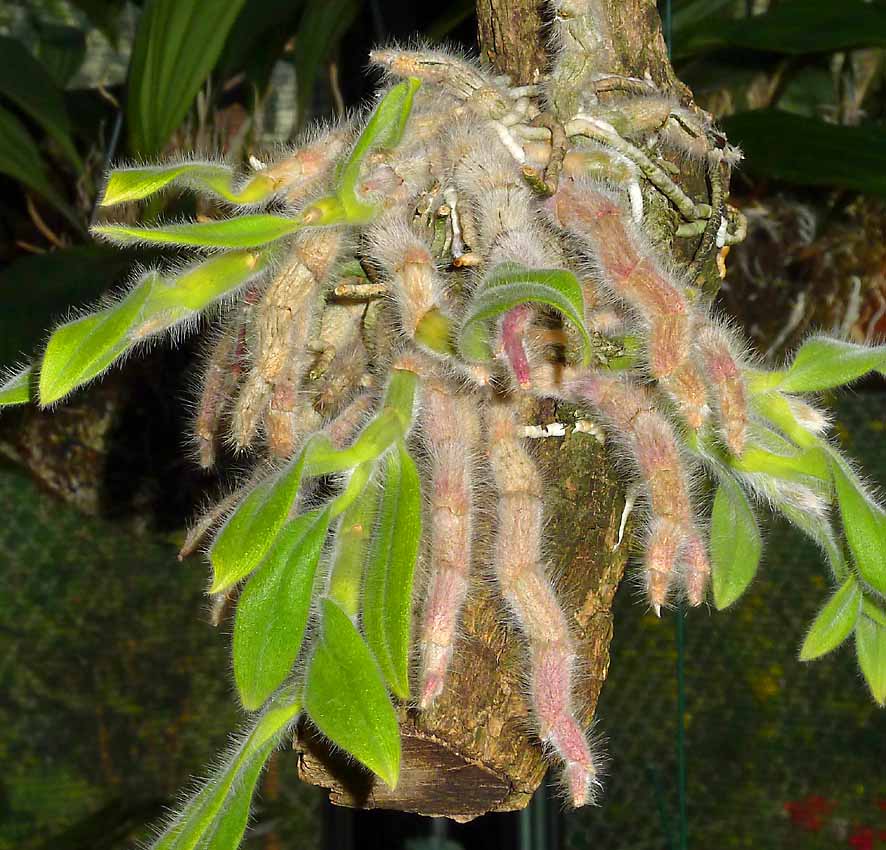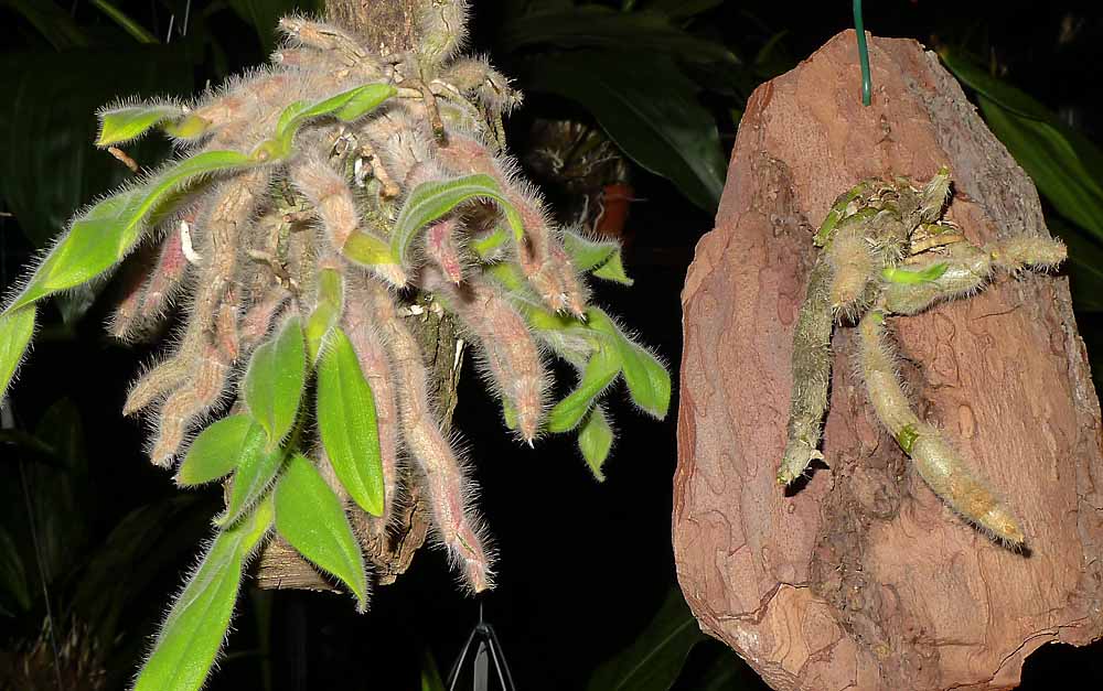 Tento druh je pro mne stále záhadou. Mám již dvě rostliny. Ta na borové kůře je z letošních Drážďan a měla dva květy. Ta vlevo je můj stále nekvetoucí trs který již začíná rašit na několika místech. Mám ho od jara 2014. Rostlina je na pohled v dobré kondici ale nekvete. Objednávám jim úspornou lampu pro rostliny květ/růst 125W. Jsem zvědavý kolik luxů s použitím reflektoru z ní dostanu. Kytka do podzimu ještě snad naroste. Jinak je v kultuře zcela bezproblémové. Nyní jsem ho vícekrát rosil a i máčel a kytka je v pohodě jako ten největší plevel. Také jsem zvědavý jestli se oba klony budou chovat stejně nebo ne. Tak doufám, že příští zimu budu úspěšnější. "Vyhrožování" suchem tomuto druhu v mé kultuře evidentně kvetení nenastartovalo.