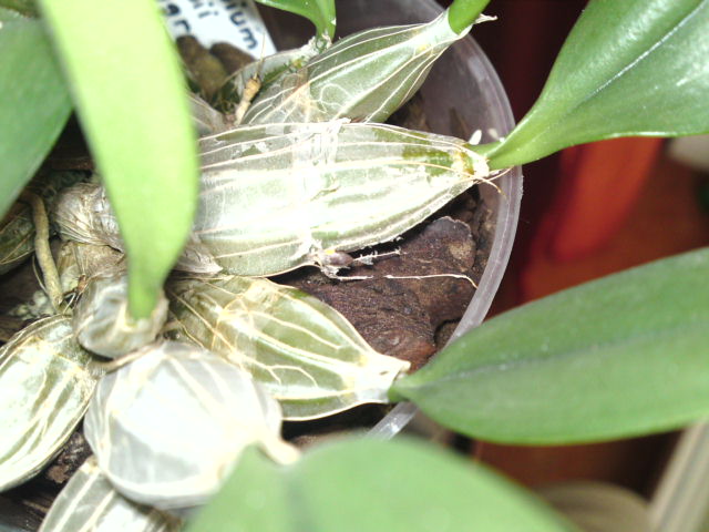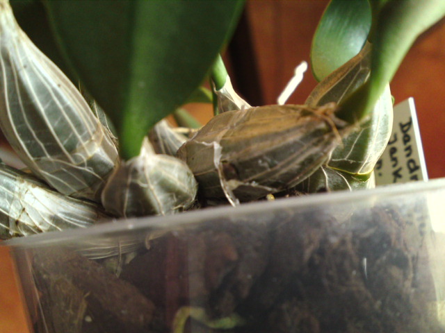 Tak se hlásí o slovo opět další jaro a s ním spojená nová aktivita orchidejí. Jsem velmi rád, že se již probudilo k životu i toto Dendrobium. Již několik týdnů pozoruji pouze nové svěže zelené špičky kořenů, které však vše směřují od zdroje světla- od okna , jakoby mi tím možná rostlina chtěla naznačit, že je umístěna na příliš exponovaném místě, nebo pouze kořeny hledají čeho by se uchytily, nevím. Co mi však již asi delší čas unikalo, byly změny daleko důležitější, ale na první pohled skryté....schválně, zkuste si z následující fotky vyzkoušet Váš postřeh, zdali něco zajímavého zahlédnete?