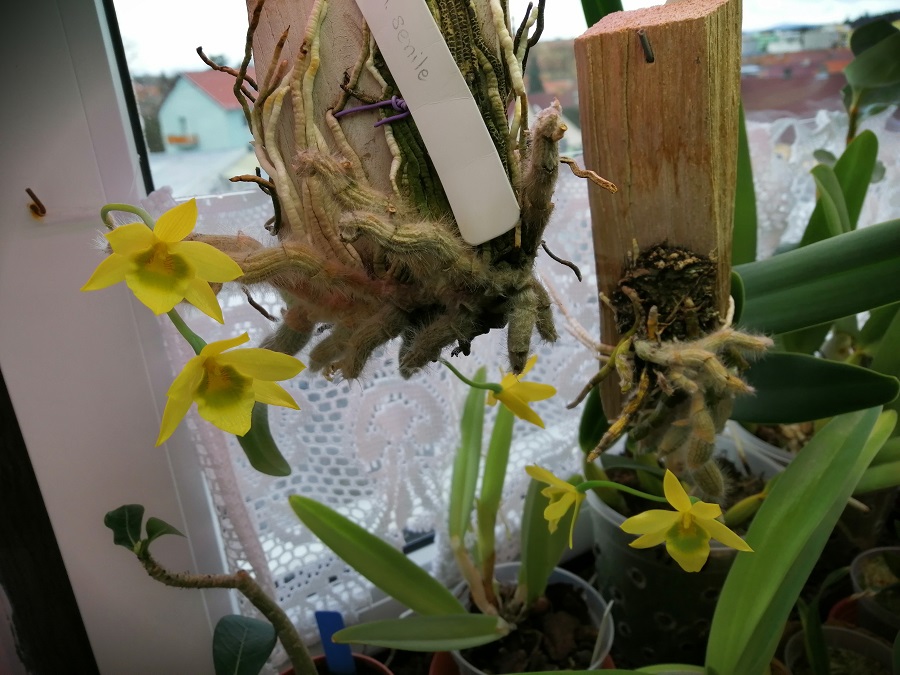 vizir: Kvetou Vám krásně! Když už kvetou tak Vám pokvetou i v budoucnu. Mě těch 6 květů asi také vykvete, nevím ještě jestli se sejdou ale to je jedno. Nyní budu simulovat suché jaro s velkými výkyvy teploty. Pokud neopadá a nenasadi do konce března tak ho budu pěstovat jako ve vegetaci a na podzim ho zkusím zasušit už v půli září. Letos mi raší zvlášť brzy a tak doufám že do půli září udělá 2 pahlizy na rhizomu. Raší mi nyní již opět na cca 10ti vyhonech. Za chvíli se už na tu větev ani nevejde  Rostlina se po namočení hezky napila a rašení je teprve v zárodcích a tak stále doufám  . Loni mi např. jedno D. harveyanum nasadilo na podzim a druhé až koncem února. Také D. parishii mi nasazovalo až v březnu kdy již rašilo a to je z dosti podobných podmínek a stejné nadm. výšky. Také Karlos kdysi psal, že ty pahlízy musí všeobecně projít určitým obdobím klidu kdy vyzrají a jsou schopné nasadit. Ty předloňské odpočívaly rok a nasadily. Ty podzimní jsou ale napité a opadaly zatím minimálně. Myslím že tak do půli března je šance že by mohlo nasadit. Myslím že tohoto "hajzlíka" má málo lidí, protože nikdo sem nedává kvetoucí kytky ani se nezapojuje do diskuse. Asi to že nechce kvést kdekoho odradí. Jinak květy má ale nádherné a ty chlupaté stonky to je fakt paráda. I do bytových podmínek by asi bylo vhodné když Vám takhle jdou.