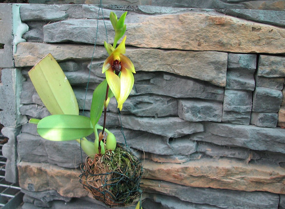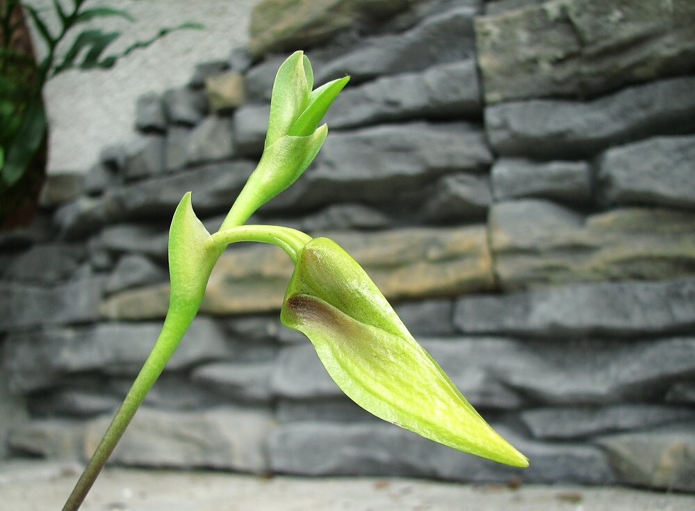 Tak je druhý den rozvit. Květ je docela velký ,zajímavý tím že pysk je pohyblivý -kvůli opylení jiná záležitost mě nenapadá.Je to taková jakoby přírodní houpačka.Vůně -jestli mohu posoudit -nesmrdí.Někde jsem se dočetla, že je to vůně jablečného moštu -no dejme tomu.  ještě posílám celé bulbíčko (pro Martu1) které mě ze začátku docela potrápilo s odhadem zálivky. PŘIDÁVÁM -vyhodnocení rodiny zní - vůně je prý podobná hnoji ehm...........no  -ale není to tak strašný.