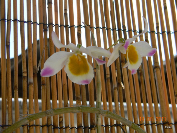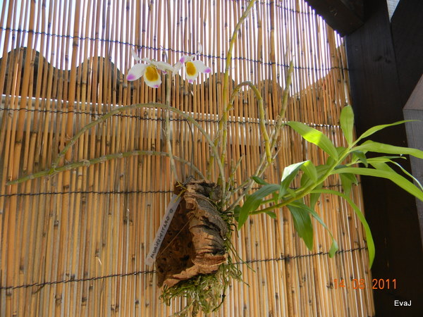 skoro po roce opět kvete toto spíš menší dendrobko se štíhlými pahlízami. Pochází z jihovýchodní Asie z nadmořských výšek 500-1700 m.n.m. Pěstování temperované, v zimě přísušek. Literatura uvádí kvetení nejvíce na jaře, mě už ale druhým rokem kvete koncem léta. Květy jsou poměrné velké, cca 7 cm a voňavé. Bohužel letos vykvetly jen dva.