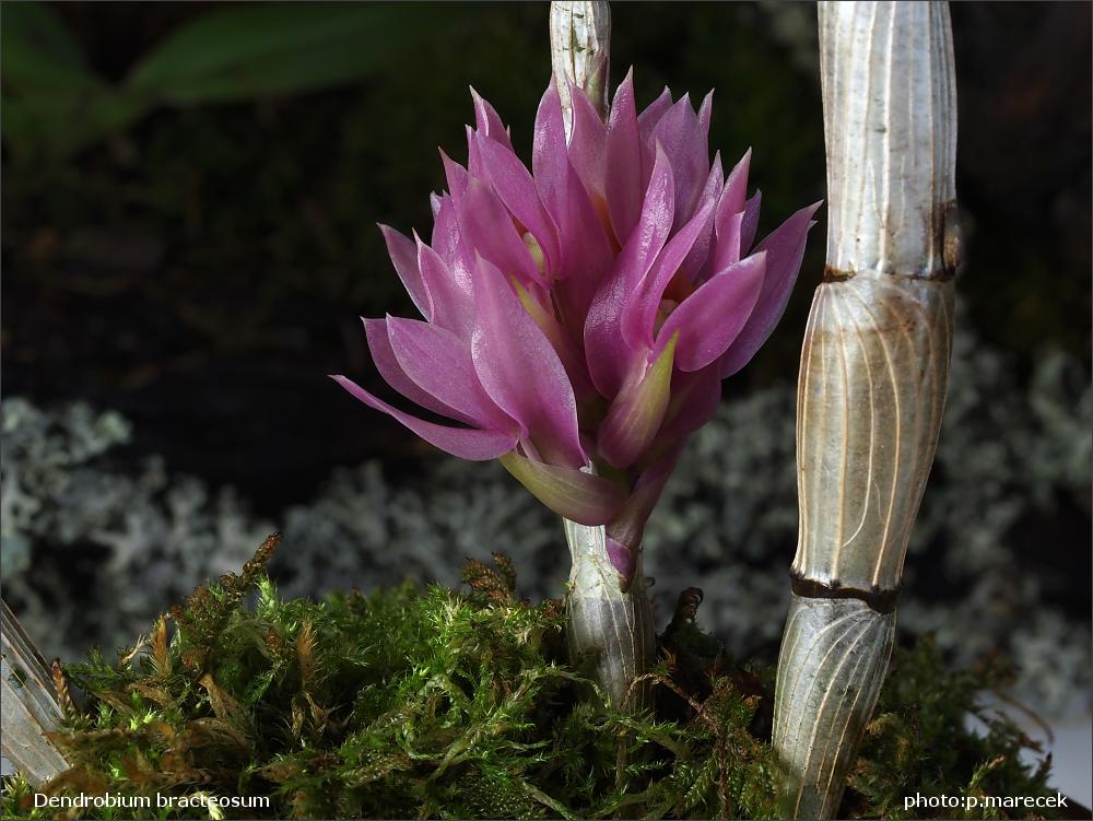 Dendrobium bracteosum, purple var.,sec.Pedilonum Rchb.f.1886 Teplomilné,Papua a N.Guinea,0-700 m.,epifyticky dešt. pralesy,mangrovníky. U mne vykvetlo po půl roce pěstování v tropických podmínkách,koupeno u Lukscheitera. Chystají se další květy,časem přidám další fotky...