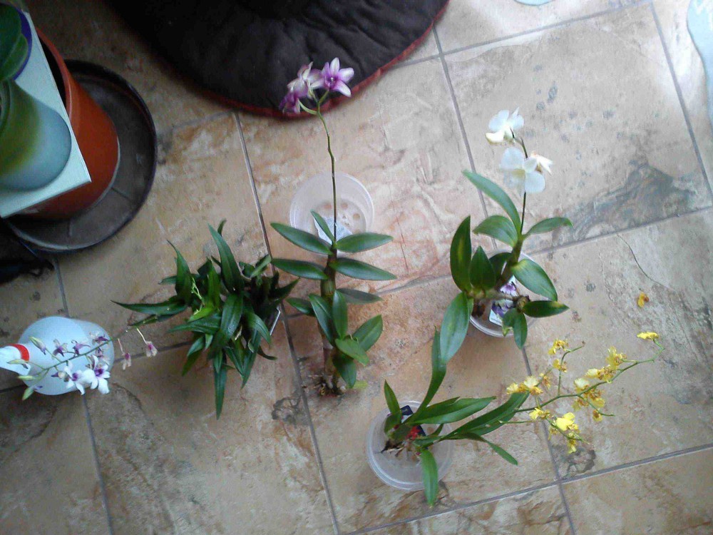 Podle obrázků jsem, myslím bezpečně, určila tu žlutou jako hybrid oncidia. Ostatní měly štítek "Dendrobium". Ta vlevo mi připadá podle fotek v tomto fóru jako D. Berry Oda. S těmi dalšími si úplně nevím rady. Mírně se liší listy (ta uprostřed je má značně masitější než ta vpravo), ale jinak mi obě připomínají Dendrobium Phalaenopsis. Je to tak? Můžu je mít všechny na jednom místě před francouzským oknem?