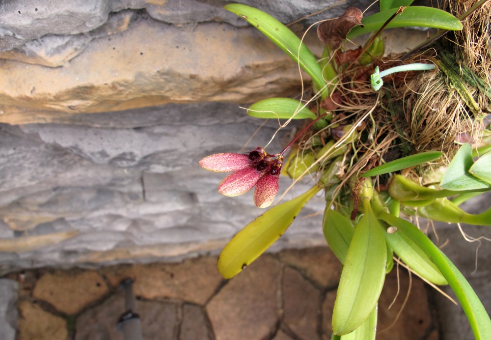Bulbophyllum lepidum Tohle bulbo mám od r.2011. Už jsem si ho zařadila do nekvetoucích. Asi to není to, čím by se pěstitel mohl chlubit ,ale mám strašnou radost. Pokvete. Na tenkých stopičkách by mělo bulbo vytvořit jakoby vějířky-to se mě líbilo tak proto ho mám. Napočítala jsem možných 6 vějířku.Teda jestli to dotáhne do konce. Snad jo...