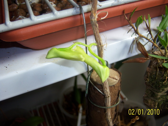 Tohle dendrobko se chystá na květ a protože má zajímavá poupata, dávám fotku. Poupata vypadají jak fazole  a v poměru k pahlízám jsou dost velké. Samozřejmě až rozkvete, přidám fotku květu.