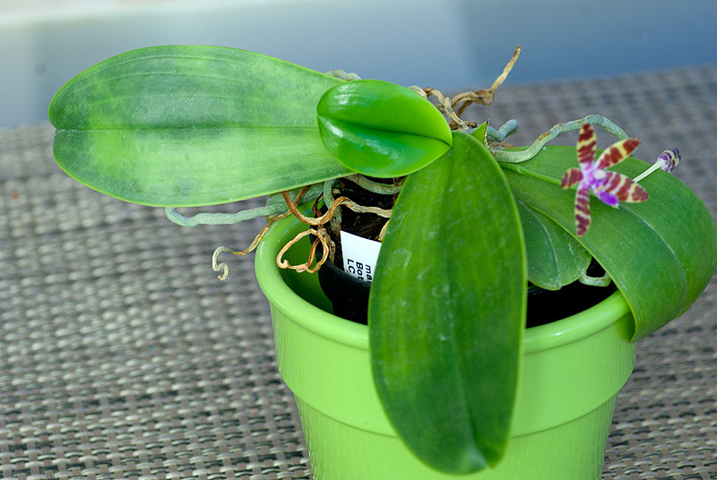 Čau, první kvetení tohoto phalu (koupený kdesi ve skleníku v Holandsku v r2008. Květ hezký, ale mrkněte na ty listy- jsou chlorotické, i když ten nový není. Neví někdo , proč to je? Už předchozí phal. belina to měl a radši jsem ho vyhodil, i když kvetl... Dík, David