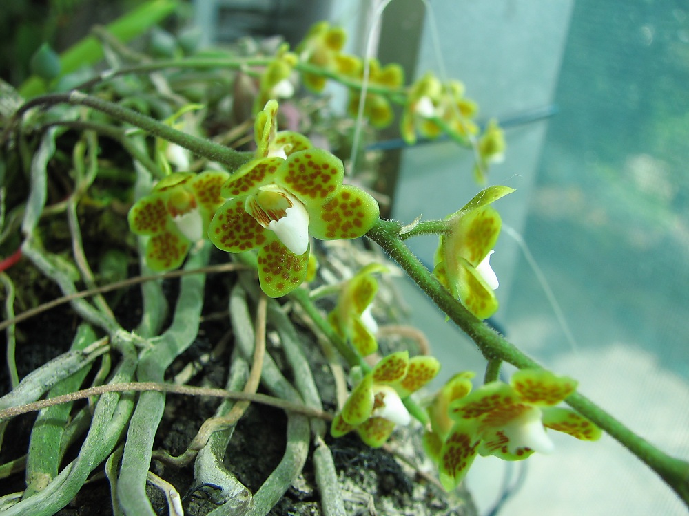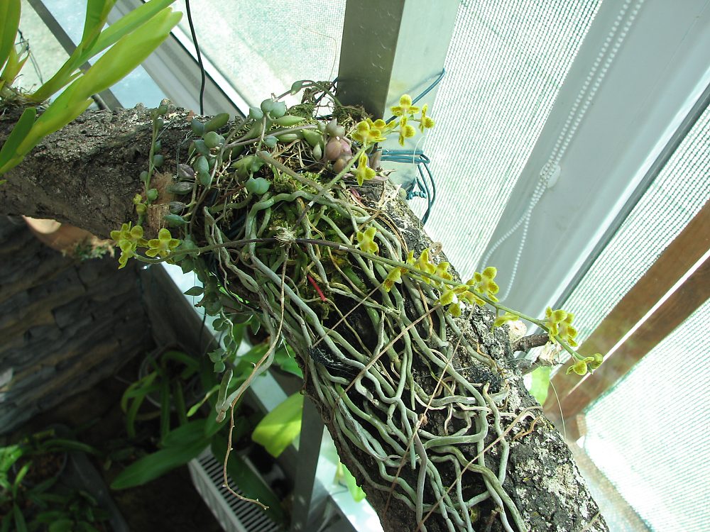 Nakonec vše tedy 4 květní stvoly vykvetly.Ty kořeny mě tak dostaly(nebylo s tím vůbec počítáno) že jsem si ještě objednala přes "pokojovky" další a to -lunifera"Bleck"-na ni jsem nejvíc zvědavá,segawai,yunnanensis.je tedy v místě kde se fotí mizerně-ale koukněte.Jsem zvědavá kdy kořeny začnou to co vlastně chci-kopírovat podložku i když možná se jí na akátu nebude chtít.Asi by měla raději něco hladkého .
