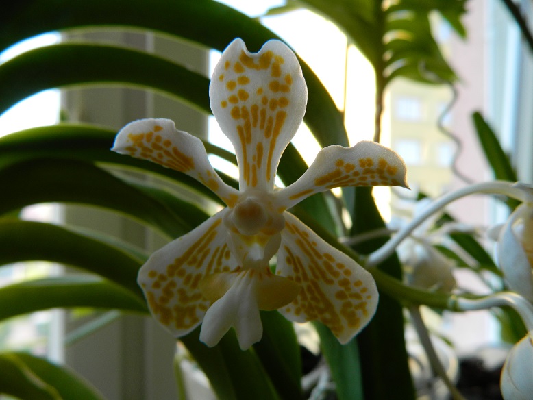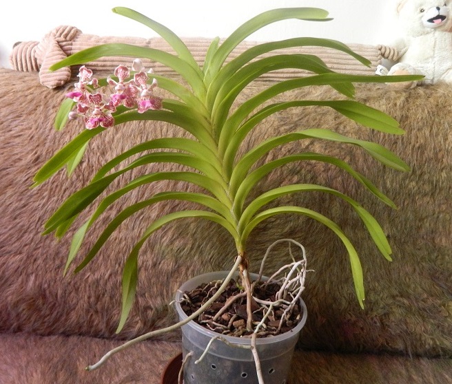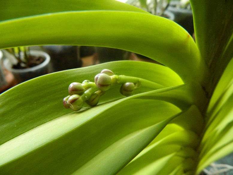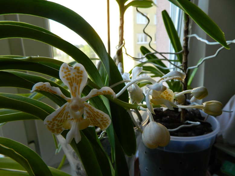 Moje vanda tricolor suavis se rozhodla prvně vykvést. Taková malá rostlinka - rozpětí listů 57cm a výška 45cm od substrátu. Ideální do bytu 1+1