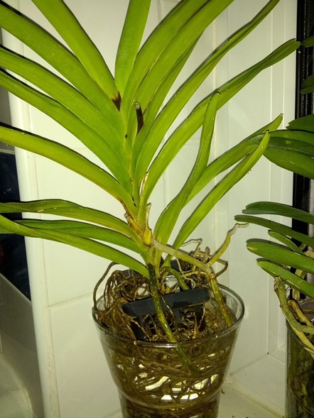 Zdravím všechny a obracím se na Vás s dotazem ohledně špatného zdravotního stavu mojí Vandy. Po letním letnění byla umístěna na zimní zahradu, kde bohatě kvetla, ale asi dva týdny po odkvětu se jí začaly svinovat listy a začala vypadat hůře. V zimní zahradě byla nízká teplota (asi 10-15 °C), proto jsem ji přemístil dovnitř na světlé okno, teplota 18-23. Na zimní zahradě byla pouze rosena, teď po přemístění (asi 14 dní) je zalévána máčením. Předtím byla umístěna v závěsu s volnými kořeny, teď jsem ji kvůli suššímu vzduchu a vyšší teplotě umístil do vázy. Při máčení zezelenává menší část kořenů než v létě a navíc odspodu začaly žloutnout listy. Ty jsem odstranil a je patrné, že jsou u báze zhnědlé. Předpokládám, že se vanda nachladila a dostala se jí voda do paždí listů při nízké teplotě. Teď nevím, jak s ní zacházet, abych jí zachránil. Prosím o rady a předem děkuji. Na obrázcích jsem se snažil nafotit, jak vypadá list, celá rostlina a srovnání se "zdravou sousedkou".