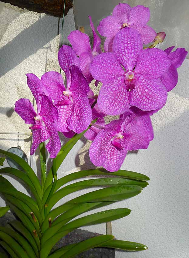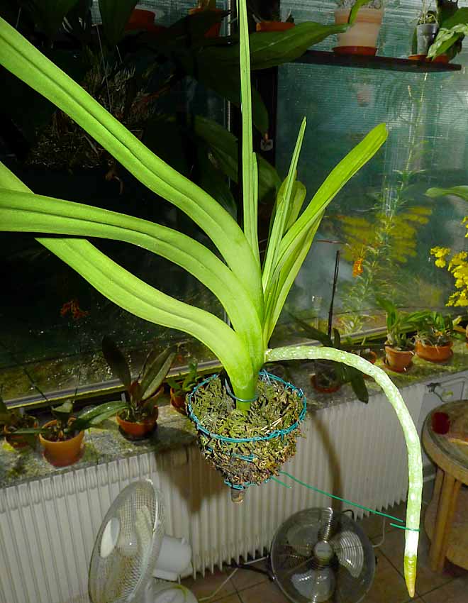 Pokud má člověk alespoň dvě Vandy tak v sezoně stále nějaká kvete. Mě se pravidelně střídají modrá a purpurová hybr. Nyní tomu je rok kdy jsem se pokoušel zakořenit vrcholový řízek modrého "nerostu" Blue Magic. Nakonec se to podařilo a řízek se po téměř chcípnutí dostává do kondice. Začal jsem mu ohýbat kořen do přijatelné polohy. U silných kořenů Vand je to obtížné i po namočení.