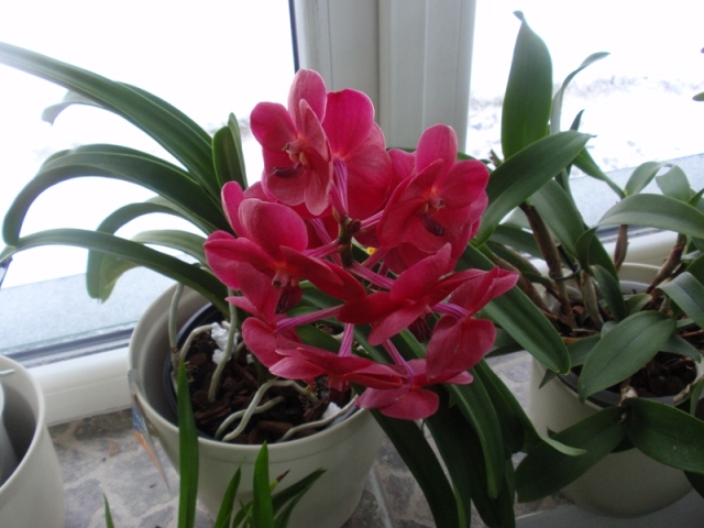 Právě mi vykvetla V. Anek Delight x Dr.Anek FCC,n. Koupila jsem jí na jaře u Lukscheitera. Vandy mám 4 a poslední jsem koupila v Hornbachu při zahájení výstavy. Je ohromná a měla tři výhony květů - poslední zaschnul. Mám ji přes celé okno. Teď ale přemýšlím jestli jsem to nepřehnala, protože ji mám jen zavěšenou na okně JV a namáčím za tři dny do dešťovky. Myslím zda tak velká nepotřebuje trochu jiné podmínky.Ostatním se daří velmi dobře - fialová mi kvete i 3x do roka. Fotky pošlu snad příští týden, protože jsem si zahnojila PC programem na zmenšování fotek a nefunguje to.