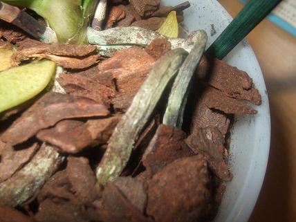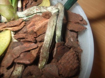 Tak dávám vědět, jak se daří mojí Phal. po tom přesazení a ustřižení kvítků... kořeny, co jsou vidět, jsou takové stříbřité, jakoby vyschlé, pokud je zaleji, trochu zezelenají, ale myslím, že ta stříbřitá barva není taková, jako když kořeny vyschnout před zalitím, protože když je ráno porosím.. opravdu jen povrch a ty kořeny, tak trošku zezelenají, ale večer už jsou zase takové "nešťavnaté"... přikládám foto..