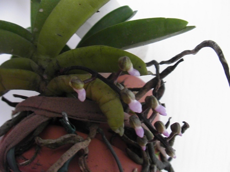 Různě jsem experimentovala, přišla mi na podzim v holém plastovém košíčku a zdálo se mi , že se ji u mě takto nelíbí tak jsem ji přivázala na hliněný květináček , na jednu vrstvičku mechu, z kamene v lese a mám ji pověšenou ve velké váze, kde je na dně vrstva rašeliníku, který držím pořád vlhký.Takhle ji konečně začaly růst kořeny a zvětšovat se listy a růst květní stvol. Celá váza je nasunutá kousek nad topení, protože jsem zjistila , že asi chce hodně tepla, protože teprve tak začala růst a každý den ji celou i s poupaty namočím do dešťovky a hned vytáhnu, teď jak se začne otvírat tak budu máčet jen spodek, aby vlhko nešlo na květ.A když svítí slunko tak jí ho dopřávám co nejvíc. Jsou tam dvě rostlinky a tak to musím točit tak, aby sluníčko šlo i na tu menší, ale je vidět , že ta větší ji stíní, ale musí si nějak poradit. Tak to je asi vše, taky už se těším až vykvete.
