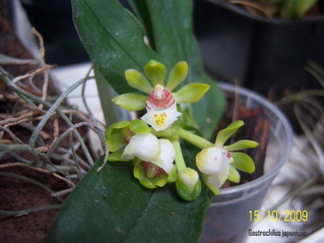 ač se velikostí nezdá, přesto patří sem, do rodu Vandeae - Gastrochilus japonicus. Je to opravdu miniatura, květ je velký necelé dva centimetry. Přivezla jsem si ho z Drážďan i s poupaty, která se teď začínají rozvíjet. Mám z ní velkou radost.