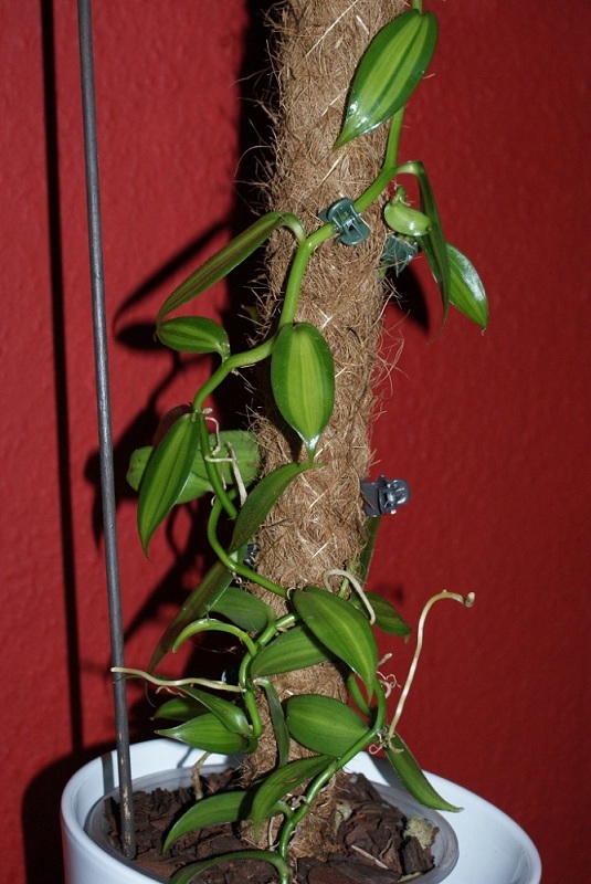 Dobrý večer. Pozoruji, že nám ta vanilka dává všem, kteří toužíme po květu, pěkně zabrat. Nino, zkuste jí dát do klasického substrátu pro pokojové rostliny a přimíchejte do něj pár kuliček nadrobeného polystyrénu. Já tu svoji letos na jaře přesadil a seříznul (květnové foto výše). Před měsícem jsem měřil jak rychle roste. Hlavní výhon je přes pět metrů dlouhý (od května), za týden přibyl o 15cm. Točí se kolem celého okna, ale kvést se mu nechce. Přikládám dnešní foto.