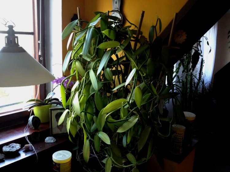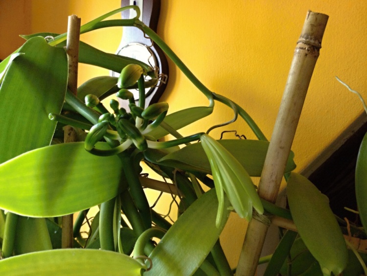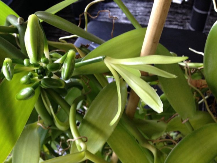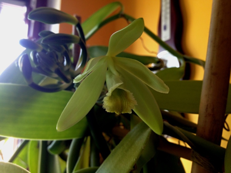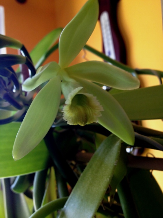 Zdravím po delší době kolegy orchideaře. Tak jsem se po téměř 20 letech dočkal květů na moji vanilce. Pěstování jsem popisoval v tomto vlákně na str 5 nebo 6. Nic jsem od té doby neměnil, akorat rostlina je již asi dva roky zasazené místo v květináči v truhlíku po muškátech. Mám zasazeny dva výhony. Každý má přes 15m. Květy se otvírají po jednom. Zatím to vychází jeden květ obden. Na rostlině mám jeden květní "stvol". Napočítal jsem 15 poupat, ale ty uprostřed nejde přesně spočítat, protože jsou dost malý. Dnes se mi otevřel druhý květ. Ráno v sedm se začal otvírat a odpoledne po pátý už byl zase zavřený. Přikládám pár dnešních fotek (omlouvám se za kvalitu, jsou foceny telefonem).