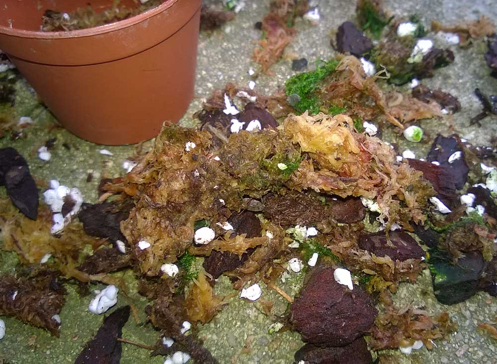 Karlos: Asi máte pravdu, ta kůra a polystyren jsou přidávané při přesazování asi u Lukscheitera. Střed byl čistý rašeliník. Osvěta jasně- co člověk koupí to se musí přesadit už kvůli revizi kořenů. Zdenka: Myslím, že jste to trefila a teprve u Vás kytka dostala to správné- však Vám to dává také najevo