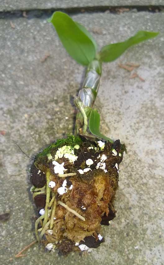 Unicum jsem kupovala v Drážďanech, bylo navázané, ale i s balem rašeliníku. Už se to zařasovalo, když jsem ho kupovala. Převázala jsem ho na kůru bez rašeliníku, podložila jsem ho jenom trochou palmových vláken (to mám od Romana, není to kokos) a sedí navrchu. Dělá kořínky, žene výhon, tak si myslím, že je spokojené.