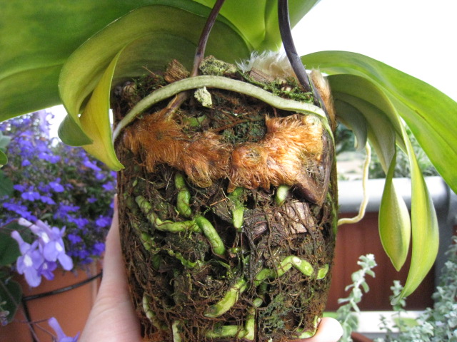 janemi píše: Ráda bych se zeptala zkušených: pěstuji orchideje převážně s kapradinami a jinými doprovodnými rostlinami teprve třetím rokem. Teď vyvstal problém - Phalaenopsis hůře vysychá, listy začínají žloutnout, rašící květní stvol se zastavil a rostlina neroste. Vyklopila jsem ji z květináče (zasazeno v kokosu) a celý kořenový bal je svázaný kořeny kapradí. Povrch je místy mazlavý. Nevím si rady, napadlo mi z dostupných informací prolít hypermangánovým roztokem nebo roztokem odvaru z heřmánku (můžu měřit konduktometrem). Neumím si představit jak rostlinu přesadit, protože kořenový bal je svázán kapradinovými kořeny velmi napevno, v podstatě se dá říct, že "květináč ani není potřeba". Kdysi jsem četla radu od Paphia: při pěstování kapradin s orchidejemi je potřeba jejich růst omezovat. Nevím ale jak a tohoto způsobu pěstování bych se nechtěla vzdávat. Připojuji fotografie. Příloha: IMG_1846.JPG Oddenky kapradin je třeba občas vystříhat nůžkami, kořeny obvykle neodstraňuji a sázím do větší nádoby se substrátem s přiměsí polystyrenu. |