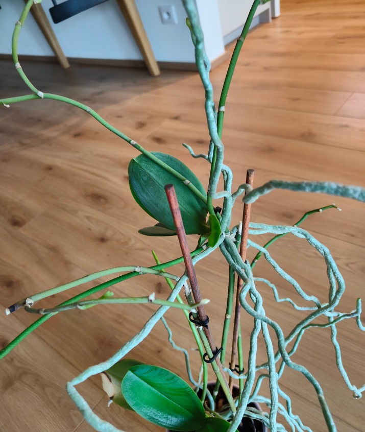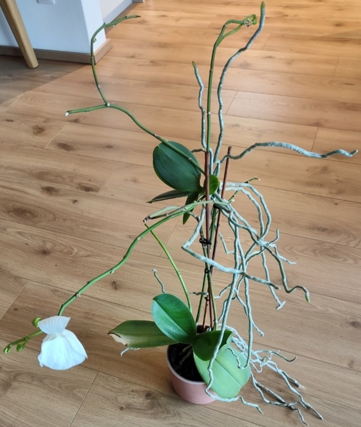 Doporučuji odstřihnout stvol pod novou rostlinou, řez ošetřit třeba mletou skořicí a nechat několik dní zaschnout. Potom namočit kořeny, aby se daly lépe smotat do květníku a rostlinu zasadit do kůrového substrátu.