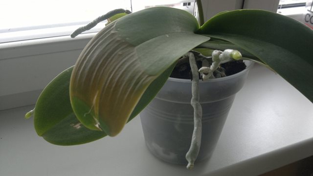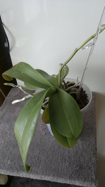Děkuji za reakci! Jak jsem říkala, nejsem žádný odborník a orchidej jsem dostala bez popisku, tudíž si nejsem jistá, ale předpokládám, že je to Phalaenopsis. - mám ji umístěnou na parapetu okna, žádné zvláštní sluníčko na ni v těchto dnech nepálí - teplota pokojová, kolem 23 stupňů - hnojivo jsem užívala podle návodu, cca 7 ml na 1l zálivky. Přikládám celkové foto a detail hnědnoucího listu. Květináč mám transparentní, ale matný, takže kořeny přes něj nejsou detailně rozeznatelné.