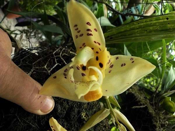 Tak pokračujeme. Rozkvetla i další Stanhopea po 15ti letech z Ekvádoru podobná jenischianě ale květ se docela liší, takže zatím nevím co to je. Jenischiana sepaly i petaly otáčí směrem vzůru a jsou takové půlkulaté kdežto tato je drží vodorovně a jsou spíše trojůhelníkového tvaru a květ připomíná spíše tvar S. frimirei. No uvidíme co na to odborníci.