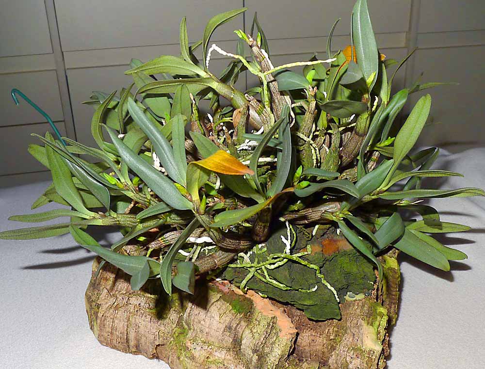 S přesazováním rostlin na kůrách je někdy problém. Nyní jsem potřeboval zvětšit podložky pro své oblíbené miniaturní trsy Dendrobium bellatulum. Pokud se hodně poškodí staré kořeny tak trvá minimálně rok než se z takového zásahu kytka vzpamatuje a přikoření k nové podložce. Abych tento rok zakořeňování rostliny ušetřil, provádím to takto. Ostrým nožem z kůry odloupnu několik vrstev i s rostlinou s nepoškozenými kořeny. Na větší podkladní kůře nebo korku si upravím plochu a pak těchto několik vrstev s rostlinou přilepím chemoprénem k většímu podkladu a zafixuji gumičkou. Po několika hodinách gumičku sundám a je přesazeno. Mezi kůrami kde není lepidlo vzniknou různé mezery kde se drží voda a rostlina rychle přikoření k novému většímu podkladu a kořeny vyplní mezery mezi oběma podklady. Někdy mezi kůry přidám trochu mechu. Takto bez poškození kořenů se dá přesazovat kdykoli i když rostliny nasazují na květ, což byl i můj případ. Ta trocha námahy se určitě vyplatí než čekat rok než rostlina dobuduje značně poškozený kořenový systém.