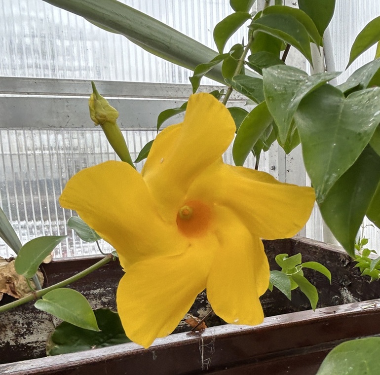 Žlutá mandevila zatím drží, tak snad se do jara nic nezvrtne a už se mi ji konečně podaří přezimovat. Nechal jsem ji v teplém skleníku u zmijovců, sem tam vystrčí i květ... Ale je to magnet na vlnatku, musím ji pořád hlídat. To samé také v teple umístěná Mandevilla 'Alice du Pont', stařičký hybrid, dost odlišný od zbylých: za prvé obrovské květy, určitě dvakrát větší než u zde prodávaných červených, bílých a různě žíhaných dipladenií, za druhé taktéž obrovské, žebrované listy. Tu jsem ale v létě vyfotit zapomněl a momentálně nekvete, tak snad zase v létě T.