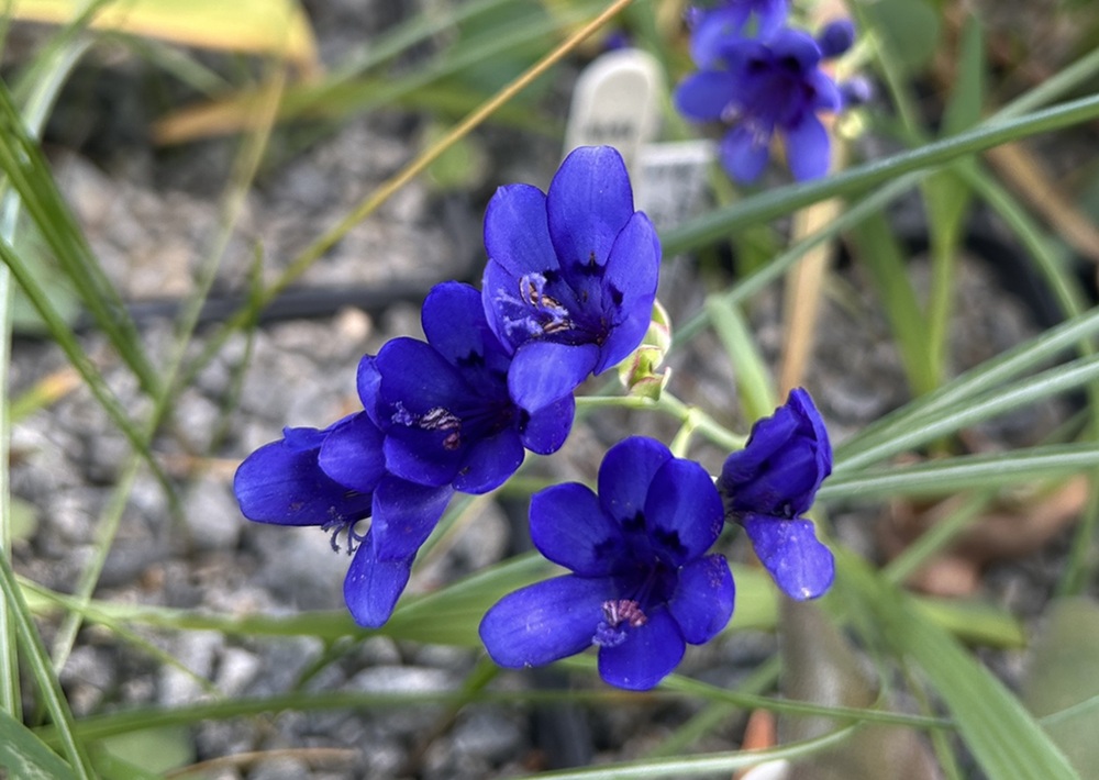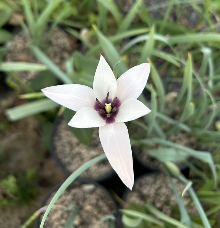 Nejmodřejší z modrých, Lapeirousia azurea, mě letos zase potěšila. Chtěl jsem ji sprašovat, ale hned vedle kvete podobná, jen světlejší L. corymbosa a dnes ve skleníku létala obrovská drvodělka a navštěvovala všechny květy, tak z toho nic nebude - bastardy se mi pěstovat nechce. Lapeirousie se u mne vegetativně skoro nemnoží, tak se příští rok budu muset o semena pokusit... Potom jeden botanický tulipán - Tulipa clusiana. Kromě téhle bílé formy mám ještě žlutou, ale ta letos nekvete. T.
