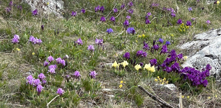 A teď něco z volné přírody. Začátkem týdne jsem byl pracovně v Mikulově a našel jsem si chvilku na Tanzberg čili Svatý kopeček. Vůbec jsem netušil, že tam v tuhle dobu kvetou kosatce nízké (Iris pumila), zjistil jsem to dole pod kopcem na tabuli u startu naučné stezky. Vyběhl jsem nahoru a začal hledat, za zábradlím dole pod kaplí sv. Šebestiána jsem zahlédl krásný modrý kus, na focení daleko. Ale pod zvonicí na jihovýchodním svahu jich jsou tisíce, tak jedna ochutnávka té neuvěřitelné variability (blbá fotka, vím) - barva květů jde od žluté přes různé narůžovělé, fialové a světle modré odstíny až k temně modrým květům. A dvě z mnoha forem. Každá kytka je originál, nenajdete dvě stejné... Bezva zážitek. A koncem dubna by měl rozkvést ještě kosatec písečný (Iris arenaria), ten je trochu vyšší a pouze žlutý. T.