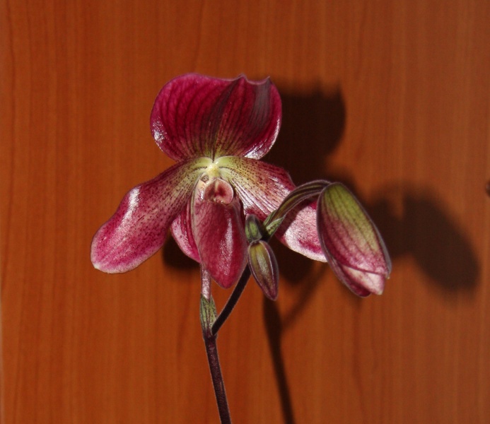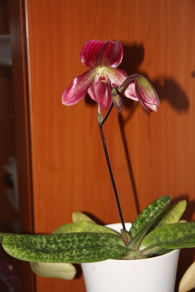 Virensovo křížení č. 46 - P. concolor var. hennisianum x Paph. Warden č.25 vini. Mám ho třetím rokem, kvetl pokaždé, ale nedaří se mi ho donutit k tomu, aby udělal dvě nové růžice místo jedné, takže jaksi nepřibývá... T.