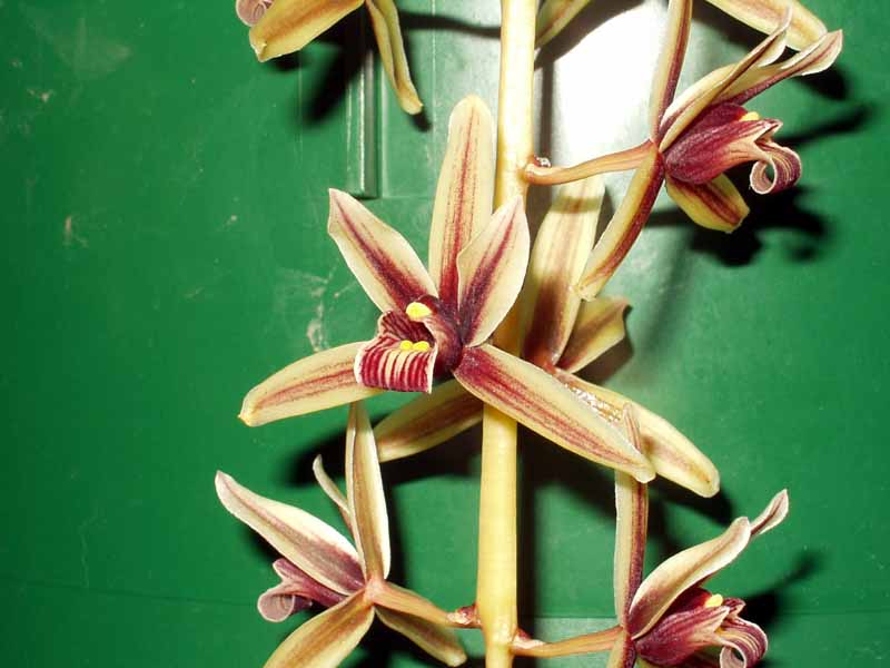 K tomu mému aloifoliu. Cymbidia, pokud jsou přes zimu v trochu větším teple pod sodíkovými výbojkami kvetou obvykle vícekrát ročně. Moc hodný na ně nejsem. Je občas slyšet, že aloifolium nerado kvete. Za dobu co ho mám si to nemyslím. Kromě jarního kvetení jsem teď náhodou, když jsem ho vytáhl k zalití ,našel několik květních stvolů.