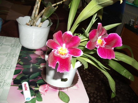 já nevím jak to, že kvetou...ještě mi pokvete jedna, dává si na čas, ale už to za pár dní bude.... teď ještě foto dendrobka a miltonky. Zítra by se měla otevřít už snad naplno další z katek, tak uvidíme....