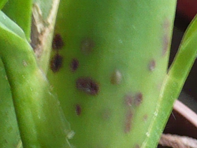 Jo tyhle problémy vznikají na teplomilných druzích často venku při poklesech teplot a častém dešti, velké vlhkosti. Z fotky je vidět , že je rostlina uvnitř, tedy patrně omezit rosení. Dobrý, často dostatečný fígl je, proříznout, nebo propíchnout tu napadenou bouličku. Na povrchu je tuhá slupka bránící odparu. Porušením nakažené místo vyschne a infekce se dál nešíří. Jinak se může šířit dál do rostliny.