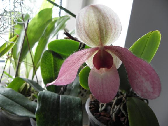Druhou rostlinou je (alespoň pro mne) dost vzácný kousek. Je to totiž asi druhá nebo třetí orchidej, kterou jsem si před cca 8 lety koupil na výstavě na Kociánce, jako relativně malý semenáček. Po prvních třech letech hledání správné cesty se konečně chytil a začal přirůstat. A letos se konečně odvděčil prvními květy. Už podle listů jsem tušil, že by to mohla být rostlina, která bude mít něco společného se sekcí Polyantha. Skutečnost ale předčila moje očekávání. Ani ve snu mě totiž nenapadlo, že by rostlina mohla být hybridem s překrásným Paph. parishii. No, výsledek posuďte sami. Tipuji to na Paph. Umatilla (parishii x philippinense). Hezký den Pavel