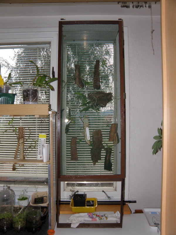 Taky myslím že je celkem zbytečné stavět hned vitrínu. Kdysi jsem taky uvažoval že visatce nasměruju směrem k oknu, ale došlo mi že to ani není možné. Muselo by se to nějak složitě otvírat abych mohl rosit, a navíc by ta voda stříkala do místnosti. Takhle to mám připlácké přmo na skle a stříká se akorát na okno, ze kterého se voda rovnou vypaří. Něco samozřejmě odkape na parapet. Kytky sice rostou směrem ke světlu, na druhou stranu svítí-li na ně slunce, nedopadá přímo na kořeny, ty jsou chráněny špalkem či plátem kůry. Občas ji vemu a osprchuju ve vaně. Absenci záclony bych doma neukecal.