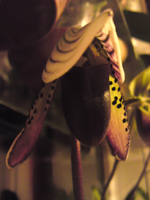 A co tato? Uznávám fotka je mizerná , jen tak matně je k přečtení název rostliny Paph.Goultenianum .Tak nějak takto asi.