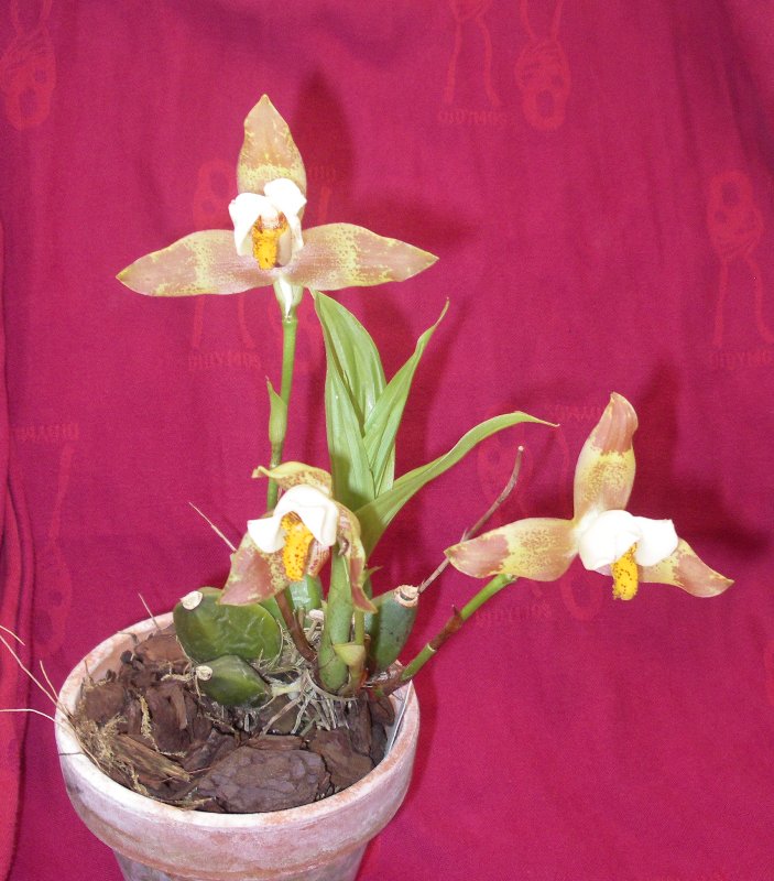 Ta druhá je rostlina z druhového okruhu kolem L. aromatica, voní krásně po skořici. Květy jsou trochu jiné než ty Pavlovy. Zatím si nejsem určením jist, čekám na knihu. Co je ale na té rostlině zajímavé, je dvoukvětost některých stvolů. Nikdy jsem se s tím nesetkal, ani moji přátelé. Napsal jsem tedy přímo kováři, a dle jeho vyjádření se to u Lycaste sem tam objevuje u dobře pěstovaných rostlin. To potěší:-)