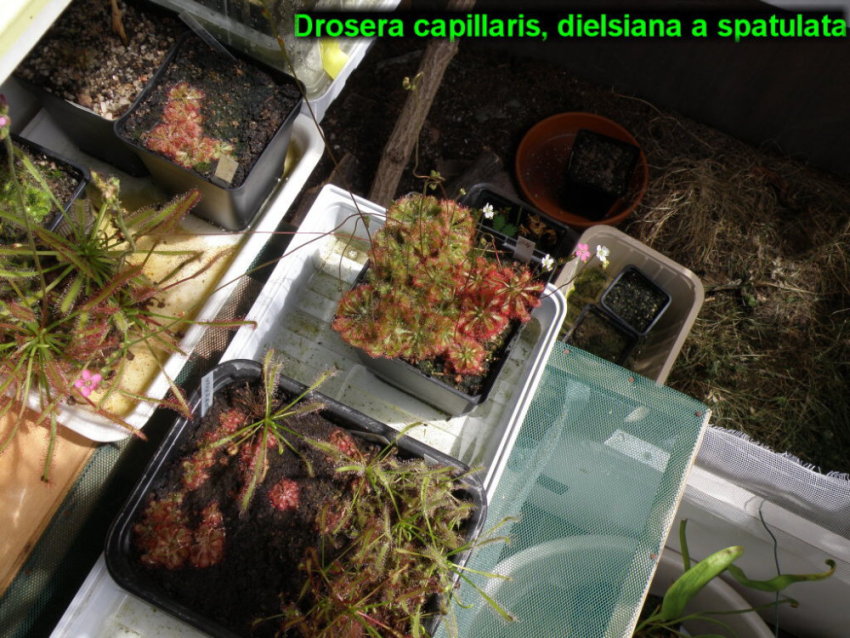 Ještě si dovolím jeden příspěvek.....a zároveň se omlouvám za monolog a usurpaci tohoto vlákna ..... Některým z vás jsem se zmínil o takzvaných australských trpasličích rosnatkách, majících domov na jihozápadě Austrálie, kde v létě panují šílená vedra, a rostlinky tak získávají vláhu jedině z mlhy od moře, občas jim ji zprostředkují keře rostlé nad nimi Banksie a Žlutocapy, které vláhu zkondenzují a předají ve formě blahodárných kapek vyprahlé zemi. Jejich růstová sezóna začíná až s prvními lijáky na podzim....proto koncem jara a v létě, když jsou vedra a sucho kvetou, a na podzim vytváří nepohlavní rozmnož.tělíska, čímž naklonováním udržují svou populaci ..... Mám jich po dlouholetém snažení asi 25 druhů z celkem kolem 46 druhů-taxonomové jsou dodnes nejednotní a vyplouvají na povrch nové příbezenské vztahy DNA. Zde uvádím pohled na některé druhy v tuto dobu. Jsou to vesměs velmi malé druhy a je potřeba mít dobré oči...či dobré makro na fotoaparátu.. Momentálně se některým choulostivějším druhům nechce z dormance, to jsou ty , co mají různotvaré stříbřité čepičky jako ochranu před spalujícím sluncem.....některé z nich již asi neprobudím....ale většině jich s příchodem vlhkého a chladnějšího podzimu začnou růst nové lístky a začnou tvořit gemmy (ona zmiňovaná rozmnož.tělíska) a během několika měsíců, než opět nadejde léto, z nich vyrostou klony původních rostlinek. Jejich květy si zdaleka nezadají s obřími velkokvěty Cattleyí a jiných orchidejí.....ale když rostlinka rosnatky má jeden cm a vyprodukuje 1,5 cm velký květ....no není to úctyhodný výkon?