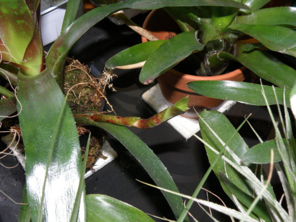 Přátelé pěstitelé....děkuji upřímně všem, kdo si vzali přebytek mých rosnatkových výpěstků....moc jste mi tí pomohli a věřím se jim bude u Vás líbit a budou vám dělat jen samou radost a při lovu kořisti a jejich kvetení zažijete příjemné chvilky poučení. Ještě je stále k dispozici omezené množství oddenků plně olistěných kapradinky Drynaria rigidula, a mohu se zbavit i několika odnoží bromelijek- Neoregelia schultesiana var. FIREBALL, a Neoregelia "RED PARROTS"....které, pokud mají dostatek osvětlení (u mne v paludáriu stačí 120W zářivek, nebo vzdálenost do 25cm od jižního okna) zbarvují se do nádherné palety barev od oranžové přes červenou až po rudý odstín . Jsou to obě velmi skladné Bromelie- v dospělosti jen asi 15-20cm výšky a zrovna tak v průměru růžice, kvetou fialovými kvítky uvnitř růžice, a ty se postupně otevírají- nevytváří své odnože v paždích starých listů jako např. Nidularium a Vriesea, ale vytváří tzv. stolony- což jsou jakési prodloužené stonky vyrostlé z paždí starších listů a na jejich konci teprve začíná růst nová rostlinka. Mám doma ještě čtyři matečnice (3 roky staré rostliny), které mají takto vytvořené již tři generace stolonů.... a to je opravdu nádhera, uprostřed nejstarší rostlina a okolo ní dcerky první generace a z nich ještě další odnože... celek vytváří dojem v uspořádání tvaru jakési zvětšené obří sněhové vložky ...škoda že nemám ZZ, kde bych jim dopřál růst i více dalších generací.