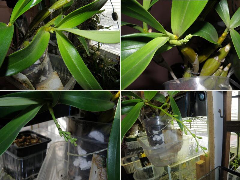 Přidávám se také do fronty čekatelů, bude to jeho premiéra. Jelikož je jedním z mála Dendrobií, které mám usazeno v kvítníku, dovolím si jej trochu více sušit - než jak jsem zvyklý u navázaných druhů- a to, od konce léta až do narašení květenství, tak že jej řádně prorosím každých asi 5 dní. Řekl bych, že už vzhledem k jeho doutníkovitým, mohutným pahlízám, jde o velmi vitální a nenáročnou rostlinu ve smyslu potřeb zimní zálivky. Růst nové pahlízy u mne připadl na konec září, trochu neobvyklá doba, ale vzhledem k nákupu rostliny v červnu a nutné aklimatizační době zřejmě pochopitelný fakt. Květenství se objevilo na předloňské pahlíze. Napočítal jsem deset poupat, přičemž bude pro mne nesmírně zajímavé srovnání detailů (již jen na fotografiích) ve stavbě květu v porovnání s podobně zbarvenými květy D.lindleyi a D.capillipes.
