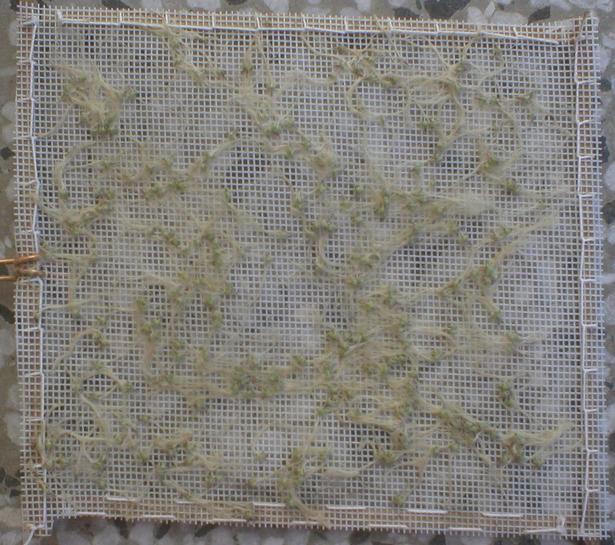 Na mělkou misku napneme silonovou punčochu, schválně jsem ponechal určitou mezeru v zakrytí povrchu misky punčochou, aby byla usnadněna údržba odparové vody....to jest její doplňování (používám čistou destilku) a také její čistění od řas, které se vždy v letních měsících vyskytnou......počkám si až se voda odpaří a poté shluky řas otvory v síti špejlí vždy odeberu.