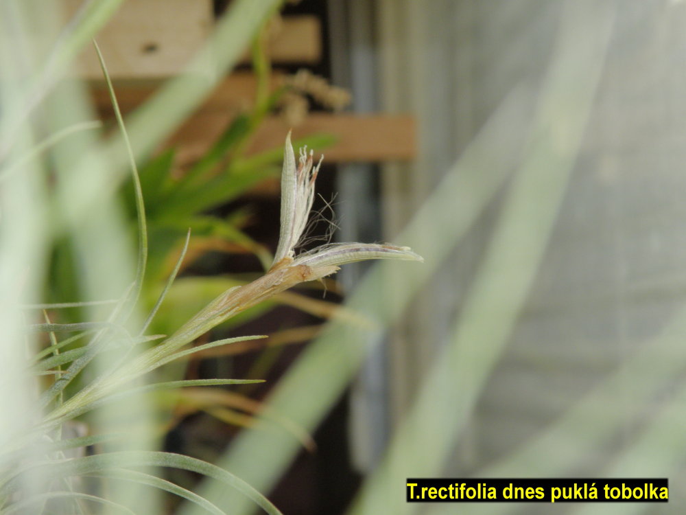 pozn.1 -(zjištěno z webu - Bromeliads image rectifolia Tillandsia native to Costa Rica. It results from a cross between Tillandsia ionantha and Tillandsia schiedeana. It has been described as a genuine species, as the population became very big in habitat. This vigorous plant produces slender, soft, pale green to yellow leaves, with a silvery base. The tubular, 3-cm long flowers are cream to violet from the bottom to the top.)