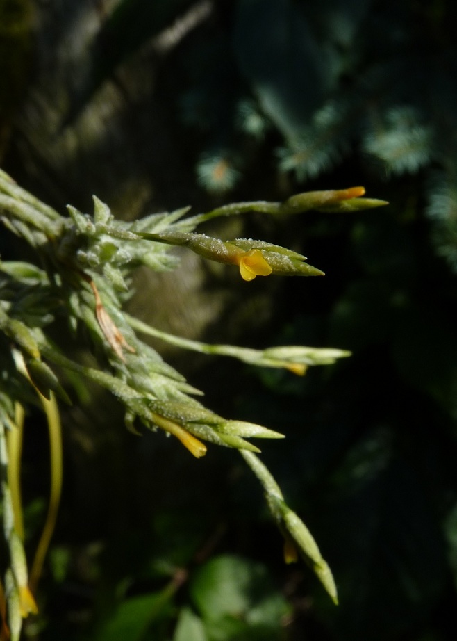 Vykvetla maličká Tillandsia tricholepsis. Je to opravdu drobínek a po odkvětu neumírá, roste vesele dál.