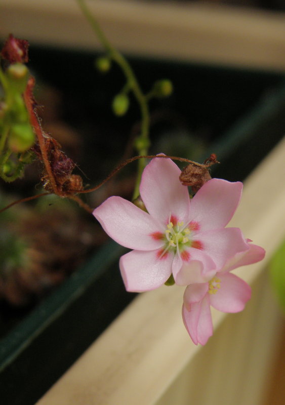 Jardo, troufám si s téměř 100% jistotou tvrdit, že jde o křížence Drosera nitidula ssp. omissa × Drosera pulchella (= D. × sidjamesii). Je to velmi odolný a rovněž květem krásný kříženec, který v létě bohatě kvete, v době letních veder nejde do té tzv. úplné dormance - (na rozdíl od některých choulostivějších druhů, které coby adaptaci na parná sucha a žár slunce vytváří ten známý, z jakoby stříbrných palistů složený odpočivný pupen, jehož tvar je mimochodem charakteristický pro každý daný druh), ale jen třeba na několik dní až týdnů jaksi rostlina zpomalí svoje růstové pochody. Zkrátka je to prostě správná pidirosnatka