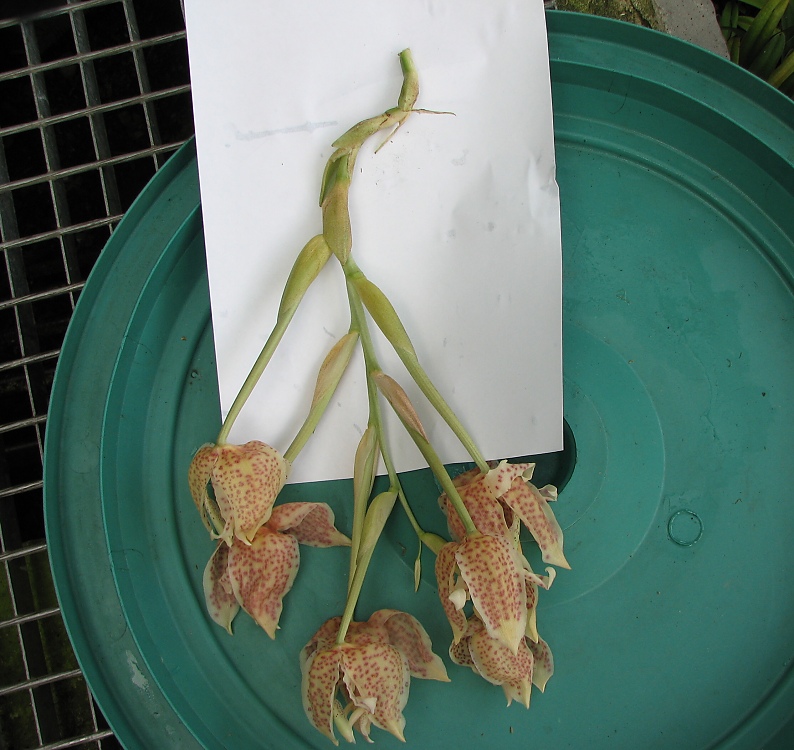 HAKI píše: olaw píše: Bohužel je jen jeden.  TŘEBA není ještě dostatečně narostlá jak vypadá nahoře?Ale i tak květ potěší no ne? Dneska jsem vypreparovala květní stvol odkvetlý .Posílám foto co dokáže Stanhopea.Protože stvol narazil na kus kůry(mám větší kousky)udělal prostě odbočku .A jede si dál ............ To odkvetla celkem rychle. Ten můj stvol prorostl sustrátem hezky rovně, ale jak vylezl ven, roste do boku, jako by se snažil rozkvést vodorovně. Jen mě trochu udivuje, že všem už kvete, tobě dokonce už odkvetla, i když jsem stvol našel mezi prvními. Ty moje dva stvoly jsou už obří boule a poupata ještě ani nejsou vidět. Kytka je sice velká, ale nechápu, jak může vytvořit něco tak obrovského