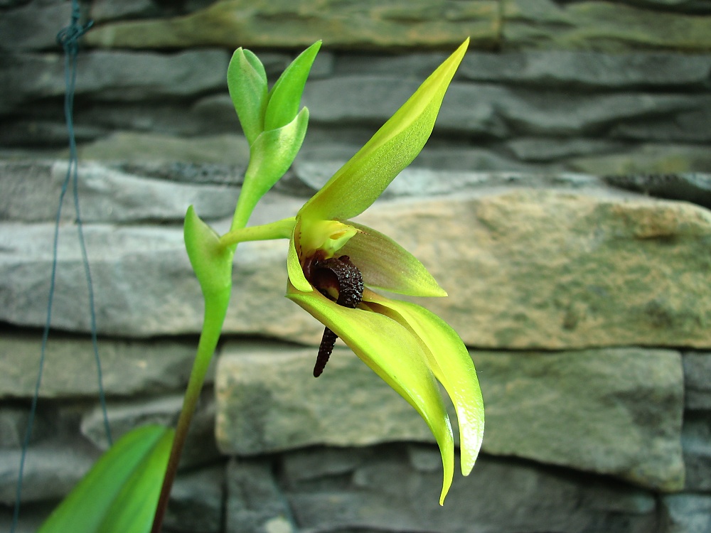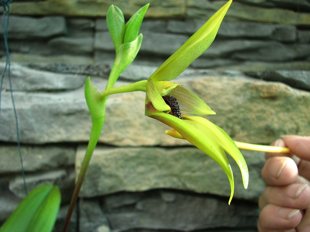 Tak je druhý den rozvit. Květ je docela velký ,zajímavý tím že pysk je pohyblivý -kvůli opylení jiná záležitost mě nenapadá.Je to taková jakoby přírodní houpačka.Vůně -jestli mohu posoudit -nesmrdí.Někde jsem se dočetla, že je to vůně jablečného moštu -no dejme tomu.  ještě posílám celé bulbíčko (pro Martu1) které mě ze začátku docela potrápilo s odhadem zálivky. PŘIDÁVÁM -vyhodnocení rodiny zní - vůně je prý podobná hnoji ehm...........no  -ale není to tak strašný.