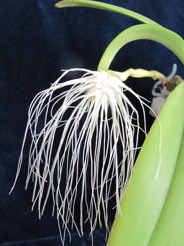 Bulbophyllum longissimum,délka květů cca 20 cm. Vykvetlo na vápencové skále v obyváku po cca 3 měs. od zasazení.... to ma-ja...vyrovnávám na 1 : 1 ...